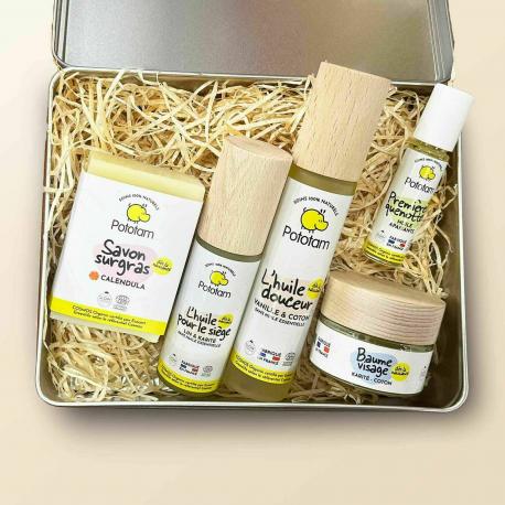 - Une Huile Protectrice pour le Siège, Lin et Karité, pour prendre soin des fesses de bébé après le change.