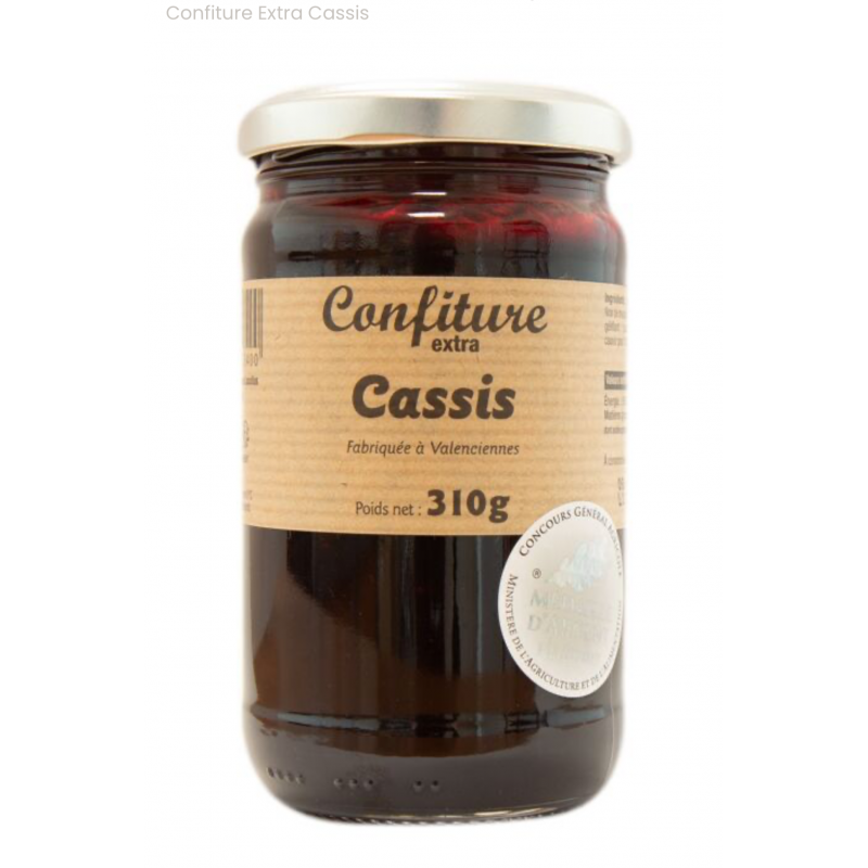 Cassis (cassis et purée de cassis), sucre, gélifiant : pectines. Préparé avec 56g de cassis pour 100g de produit fini. Traces éventuelles de fruits à coque.