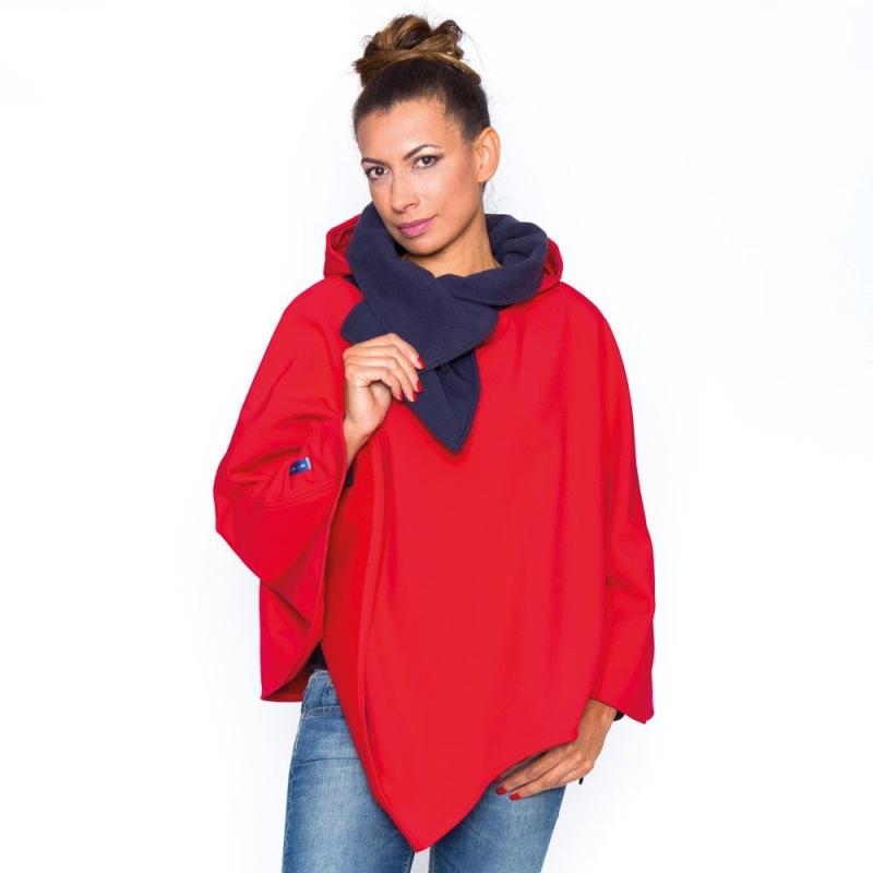 - Le poncho est confectionné d’une matière polaire et imperméable. Il possède une écharpe et une capuche et recouvre les cuisses en position assise. Son dos s’ouvre pour envelopper toutes sortes de corset ou siège sur les fauteuils roulants. Des cordons peuvent resserrer le poncho sous les bras pour être bien au chaud.